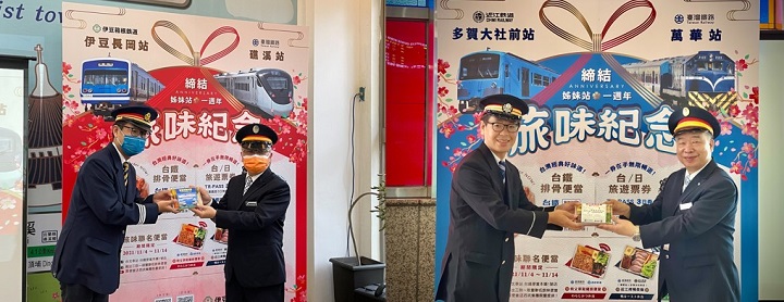 2020年11月4日西武集團旗下的伊豆箱根鐵道、近江鐵道分別跟台鐵的礁溪站、萬華站締結姊妹鐵道,至今已滿1周年。今天不僅在台鐵舉辦鐵道便當開賣儀式,也同時前往萬華站和礁溪站,由西武集團台北代表將象徵友誼長存的鐵道便當交到站長手上。