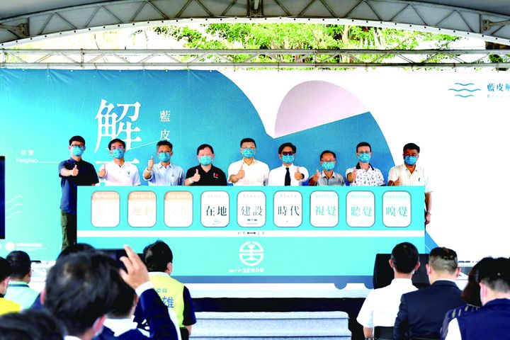 ▲轉型為臺鐵局懷舊「藍皮解憂號觀光列車」10╱23正式啟航。(左3起)屏東縣政府交旅處黃國維處長、臺東縣副縣長王志輝、臺鐵局局長杜微、雄獅旅遊總經理黃信川與貴賓合影。 圖:臺鐵局/提供