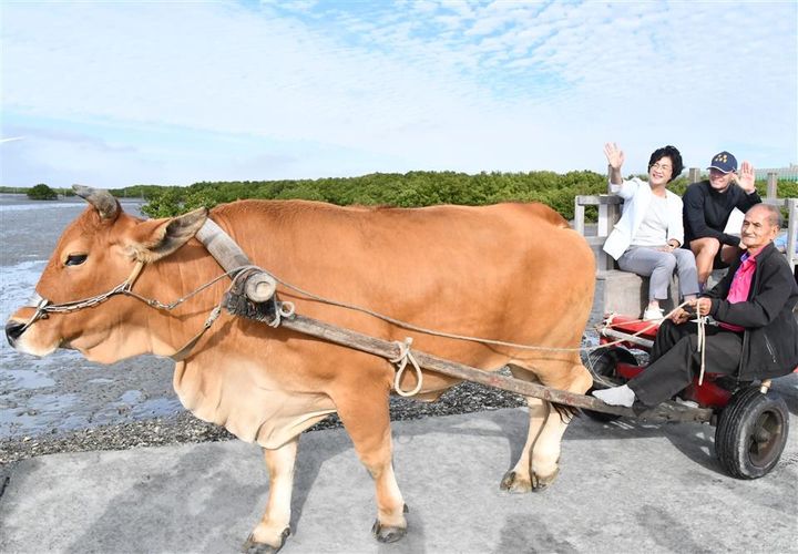 <▲彰化縣長王惠美與伊登,遊訪芳苑體驗潮間帶牛車搭乘。 圖:彰化縣政府/提供