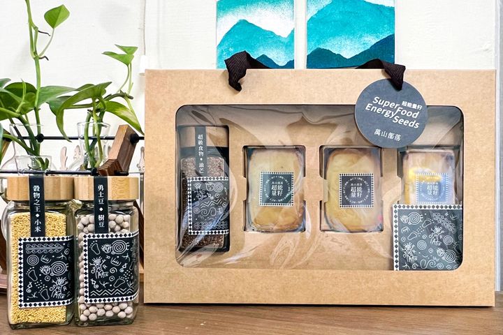 經由茂管處的輔導,萬山部落所打造的超能量籽禮盒,內含油芒餅乾共6片,搭配油芒、小米及樹豆種籽任選一款,共計三款組合。油芒餅乾富有奶香,酥脆且帶有油芒顆粒具獨特口感;三款種籽選用均來自於萬山部落在地小農友善耕作所生產;包裝複刻萬山岩雕的線條紋飾與部落的元素符碼,商品包裝極具部落的古老傳說與在地特色。