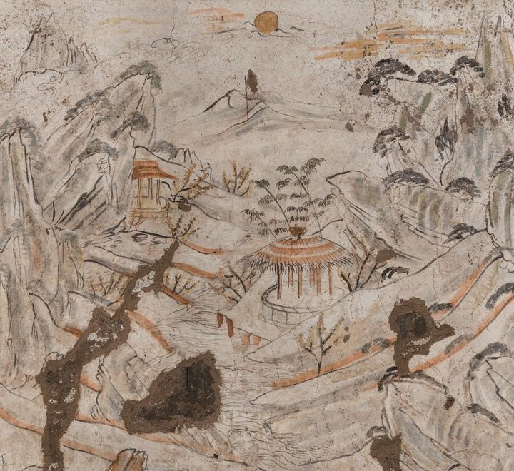 山水圖可分為由遠及近的四個層次:遠望之,一輪紅日冉冉升於遠端的地平線;畫面拉近,有樹狀若旗幟立於山坡之上;聚焦中景,兩個茅草亭一方一圆,立於山谷和水岸間的平緩地带;近觀之,左右兩岸的多條溪流匯成巨流,似乎要透過畫面,奔向遠方。